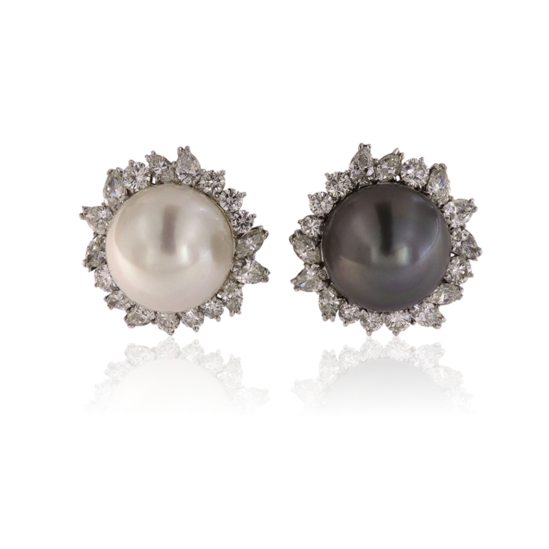 Orecchini in oro bianco dove la perfezione e la dimensione delle perle, bianca e nera, fanno esaltare la luminosità dei diamanti finemente incastonati.
