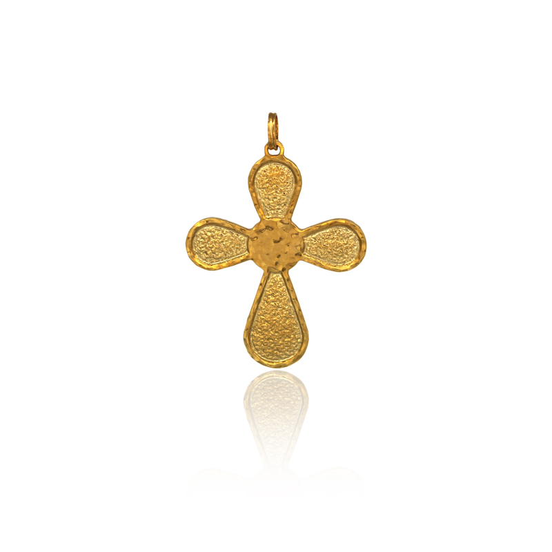 La Croce della Fonte è una croce pettorale in lega dorata, realizzata artigianalmente con traforo e bugnato. Ispirata alla forma di una goccia d’acqua, unisce il simbolo della croce a quello Cristo come “sorgente” di acqua viva. La superficie martellata riflette la luce, richiamando l’acqua che sgorga dal costato di Cristo e il Fonte battesimale, luogo del primo incontro con Dio.