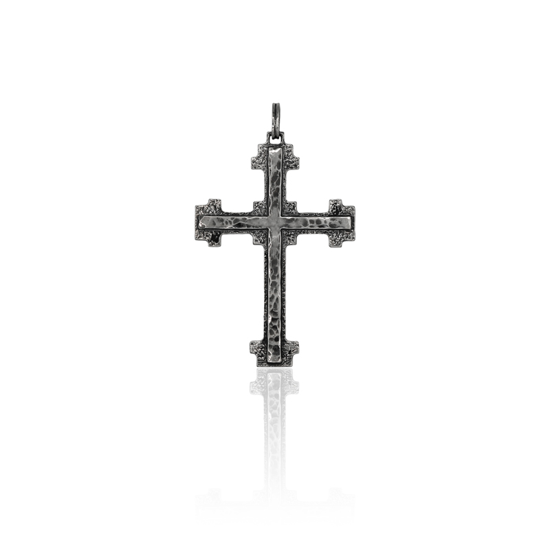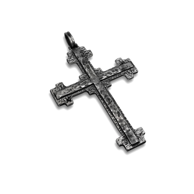 La Croce Polittico è una croce pettorale in lega argentata e brunita, realizzata artigianalmente con le tecniche del traforo e del bugnato. Ispirata all’arte medievale e bizantina, presenta una forma sobria ma suggestiva, con terminali squadrati che evocano le cornici di un polittico antico. La superficie di fondo è lavorata a bugnato, mentre la croce centrale in rilievo è rifinita con una semplice martellatura
