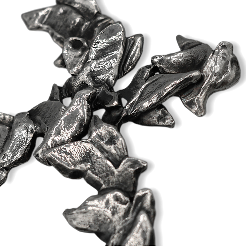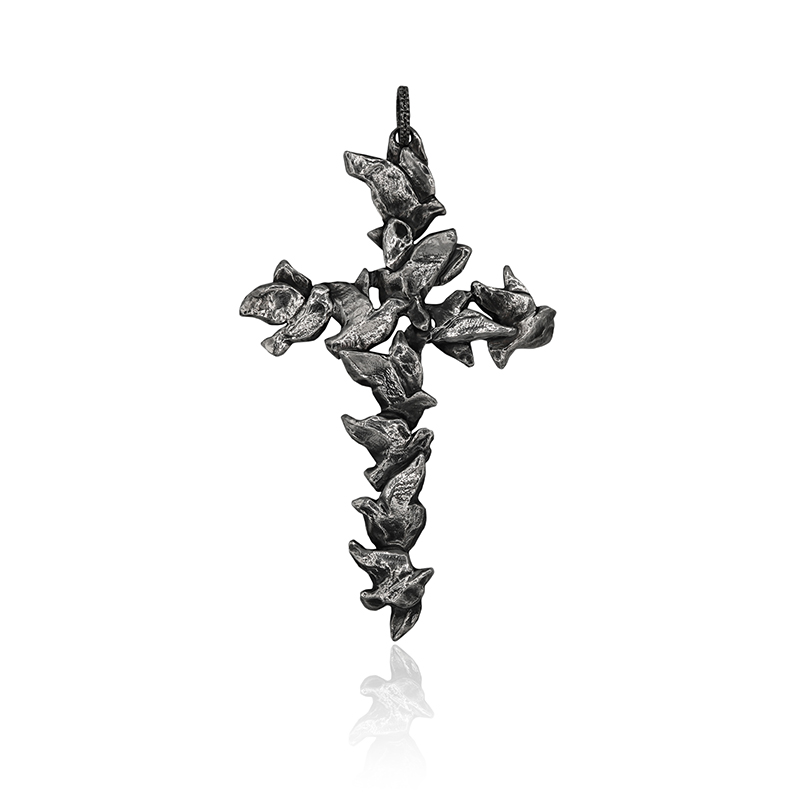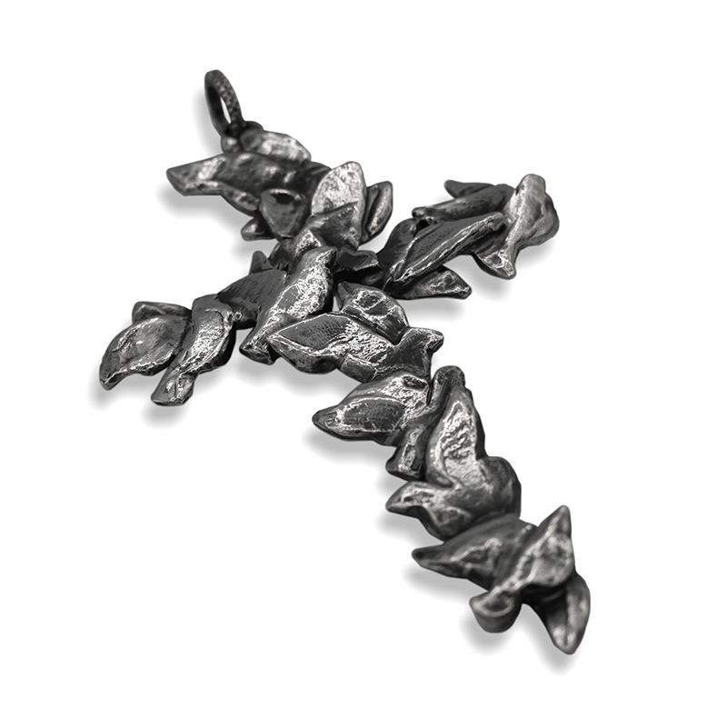 PENKO LOGO whitexweb Questa croce pettorale in lega argentata e brunita, prende il nome di Porta del Cielo ed è stata realizzata con la tecnica artigianale della fusione a cera persa. In questa creazione, una moltitudine di colombe stilizzate danno vita a una croce armoniosa, viva, leggera. Le piccole colombe con le ali spiegate, modellate in rilievo con tratti morbidi e dinamici, sembrano in volo o appena posate, come sospese tra cielo e terra. Non ci sono angoli rigidi o geometrie statiche. La croce nasce dal loro movimento, come disegnata dal vento. Simbolo universale di pace, purezza e dello Spirito Santo, la colomba è messaggera e guida verso la porta del Cielo, richiamando anche l’Antica Alleanza tra Dio e gli Uomini.