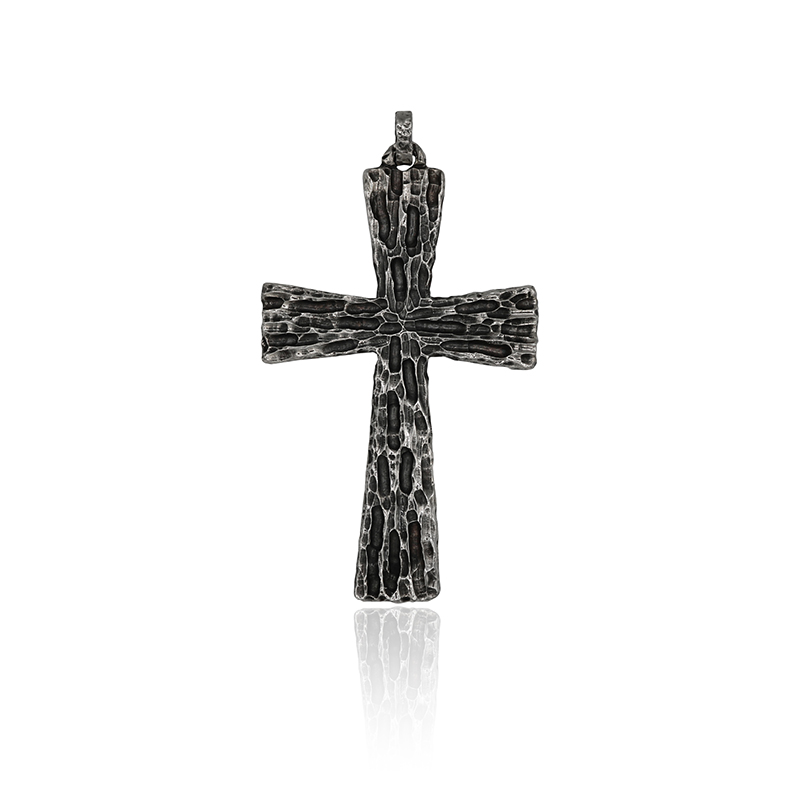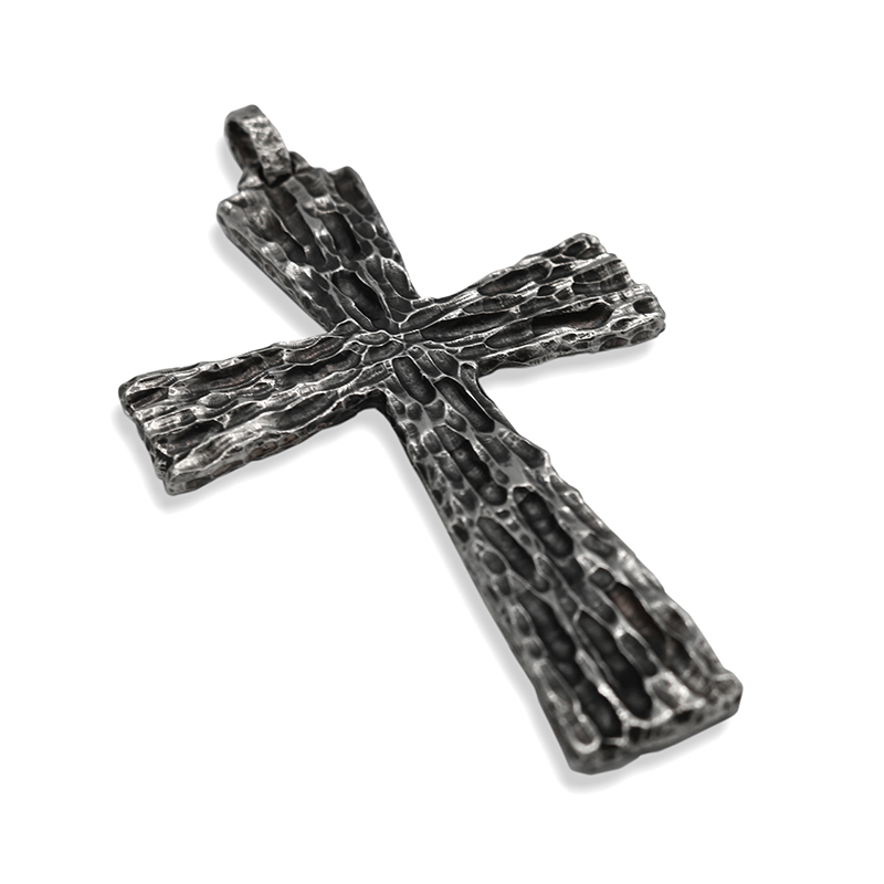 Croce pettorale in lega argentata, realizzata con la tecnica della fusione a cera persa.