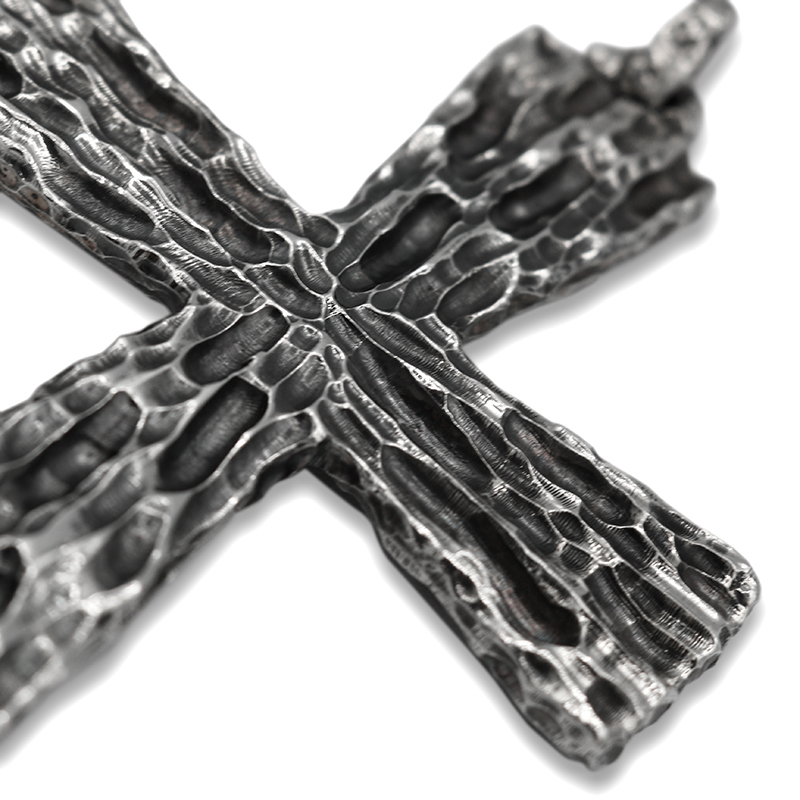 Questa croce, con la sua superficie grezza e la forma irregolare e scavata, evoca il legno della Croce di Cristo.