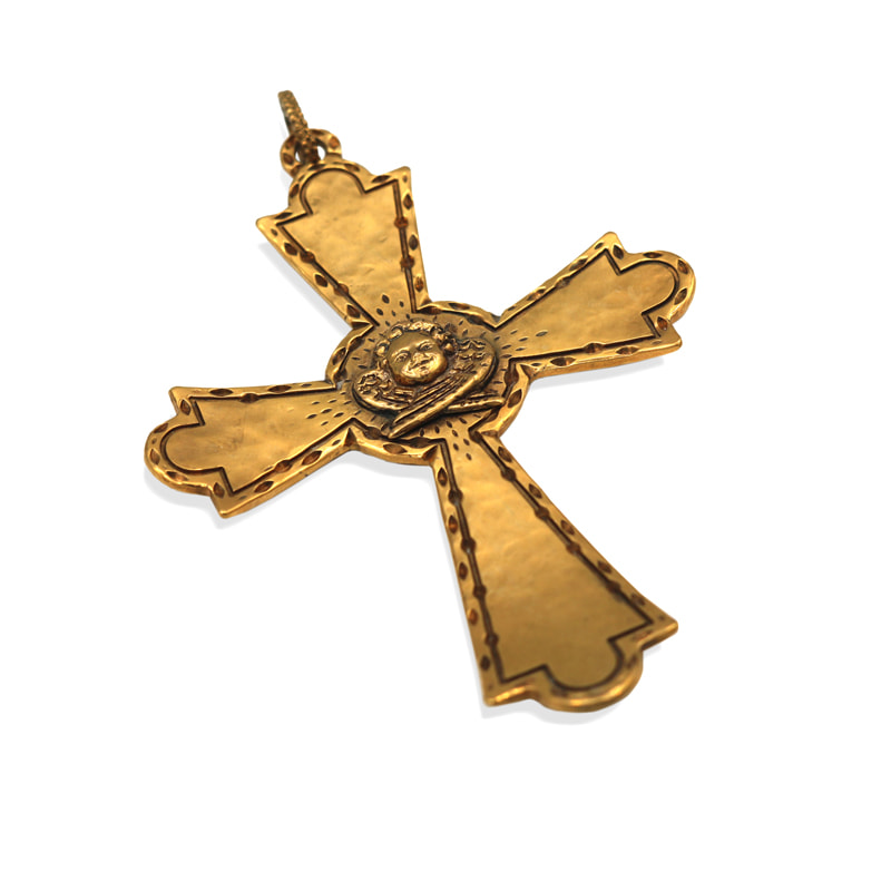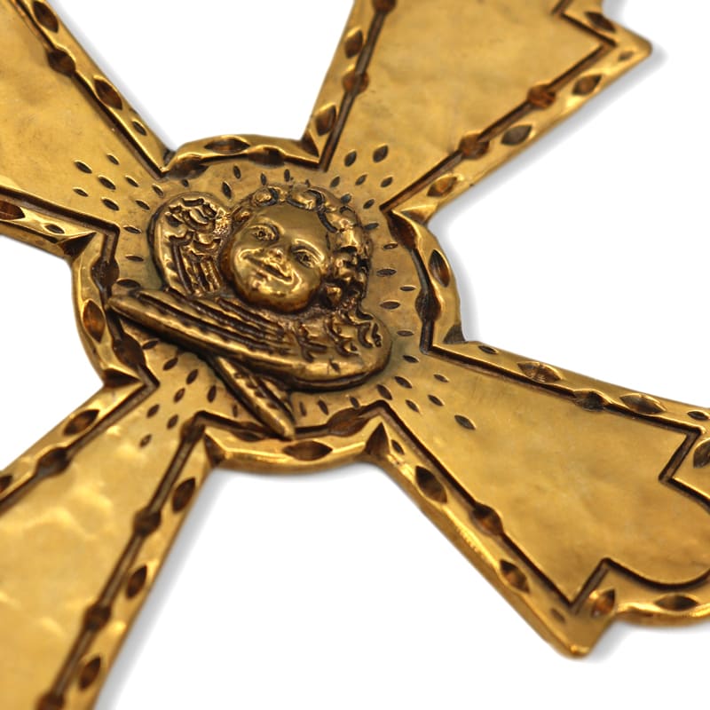 PENKO LOGO whitexweb <span style="font-weight: 400;">Questa croce pettorale in lega dorata, realizzata con le tecniche artigianali del traforo e dell’incisione, prende il nome di Croce San Pietro con Cherubino.</span> <span style="font-weight: 400;">La sua forma richiama la pianta di Piazza San Pietro in Vaticano: un centro ampio e armonico da cui si diramano bracci trapezoidali che si allargano verso l’esterno, ispirati al colonnato progettato da Gian Lorenzo Bernini nel XVII secolo.</span> <span style="font-weight: 400;">Questa geometria evoca l’idea di accoglienza e apertura universale, come le “braccia materne della Chiesa” che abbracciano l’umanità. Dal centro della croce, luogo d’incontro tra Dio e l’uomo, parte un’espansione verso l’esterno che simboleggia la missione evangelizzatrice della Chiesa, chiamata a portare il Vangelo nel mondo.</span> <span style="font-weight: 400;">Al centro della croce è presente un angelo cherubino, guardiano del Paradiso e della conoscenza divina.</span>