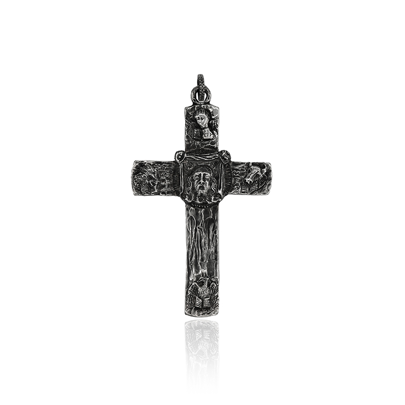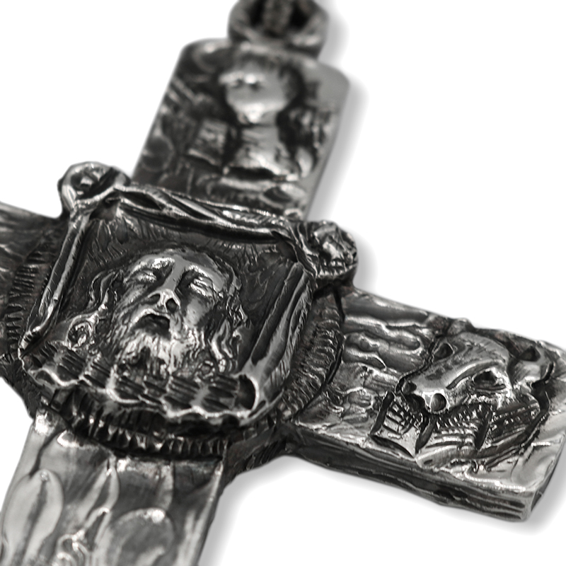 PENKO LOGO whitexweb Questa croce pettorale in lega argentata e brunita prende il nome di Veronica ed è stata realizzata con la tecnica artigianale della fusione a cera persa. Il fulcro della croce è occupato dal Volto Santo di Cristo, impresso sul velo di Veronica simbolo della passione. Sui quattro bracci sono raffigurati i Quattro Evangelisti distribuiti secondo l’iconografia cristiana del Tetramorfo: In alto vediamo infatti un angelo simbolo di Matteo. A sinistra un leone alato, simbolo di Marco. A destra un bue alato, simbolo di Luca. Infine in basso, un’aquila, simbolo di Giovanni. Così questa croce diventa una sintesi teologica visiva: al centro il volto umano e sofferente di Dio circondato dai quattro portatori della Buona Novella. L’opera racconta così il mistero della fede cristiana: dall’incarnazione, alla passione e la morte, alla resurrezione, annunciata ai quattro angoli del mondo.