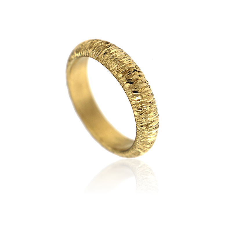 Fede in oro giallo realizzata con l’innovativa tecnica del “Penkato fiorentino” Un esclusivo trattamento della superficie dei metalli preziosi. Con questa tecnica, che si avvale dell’uso di una fresa a diamante, del cesello e dell’incisione a bulino, si viene a sviluppare un bellissimo effetto tridimensionale della modellazione dell’anello. Questa lavorazione dell’oro crea l’effetto di un prezioso filo d’oro che, avvolgendosi alle fedi, crea un legame d’amore tra gli sposi.