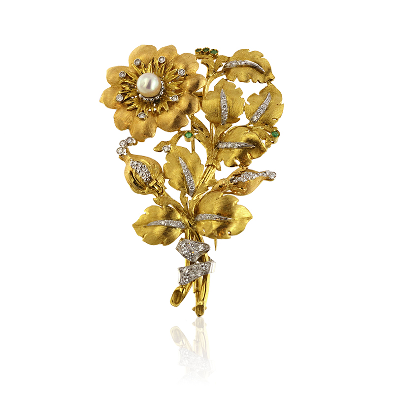 Spilla in oro giallo, verde e bianco completamente realizzata a mano, incisa a bulino e decorata con diamanti, smeraldi e una perla.