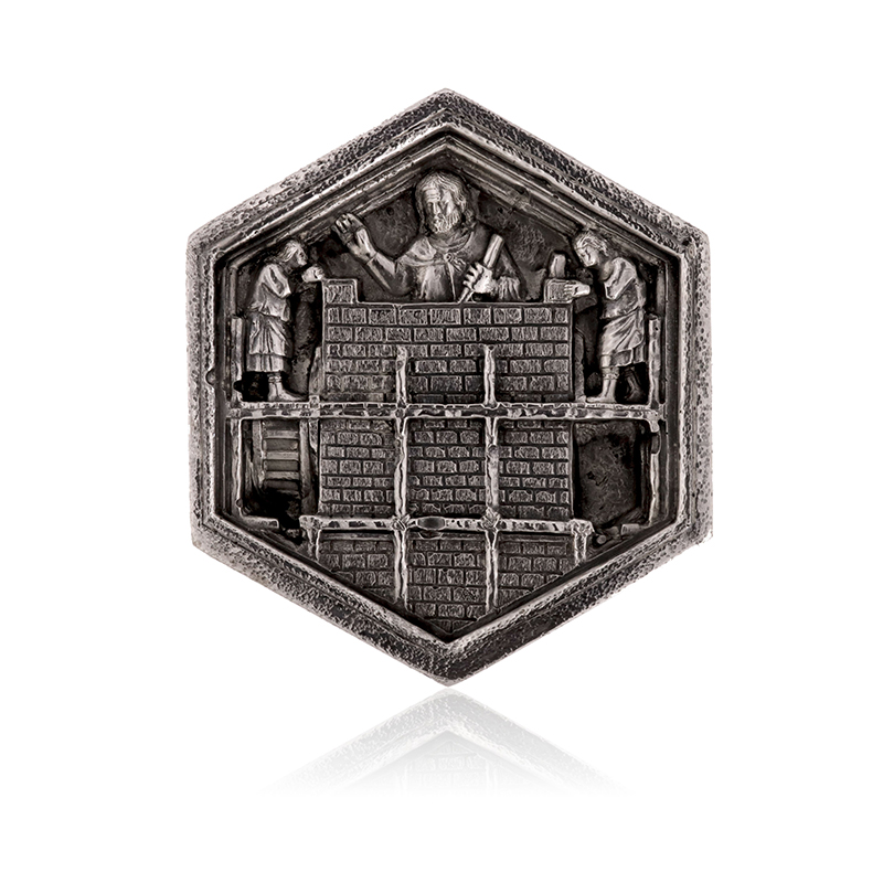 Il Maestro durante la direzione ed il controllo dei lavori. Riproduzione in argento della formella esagonale situata sul Campanile di Giotto, a Firenze, ideata da Giotto e da Andrea Pisano e raffigurante l’esaltazione del lavoro dell’uomo ed il suo processo d’incivilimento attraverso le tecniche e le arti.