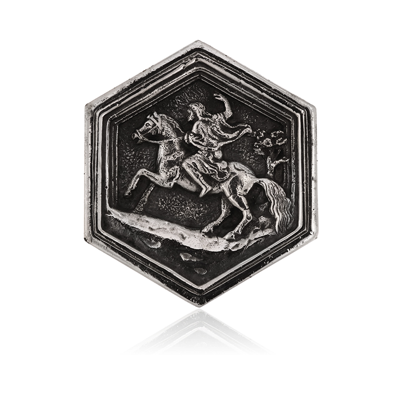 Un giovane cavaliere lanciato al galoppo. Riproduzione in argento della formella esagonale situata sul Campanile di Giotto, a Firenze, ideata da Giotto e da Andrea Pisano e raffigurante l’esaltazione del lavoro dell’uomo ed il suo processo d’incivilimento attraverso le tecniche e le arti.