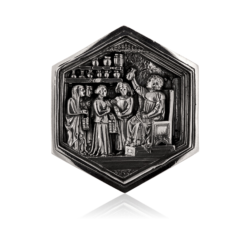 Scienza fondamentale tra le arti umane, è qui rappresentata da un “physicus” mentre analizza un composto nel suo studio. Riproduzione in argento della formella esagonale situata sul Campanile di Giotto, a Firenze, ideata da Giotto e da Andrea Pisano e raffigurante l’esaltazione del lavoro dell’uomo ed il suo processo d’incivilimento attraverso le tecniche e le arti.