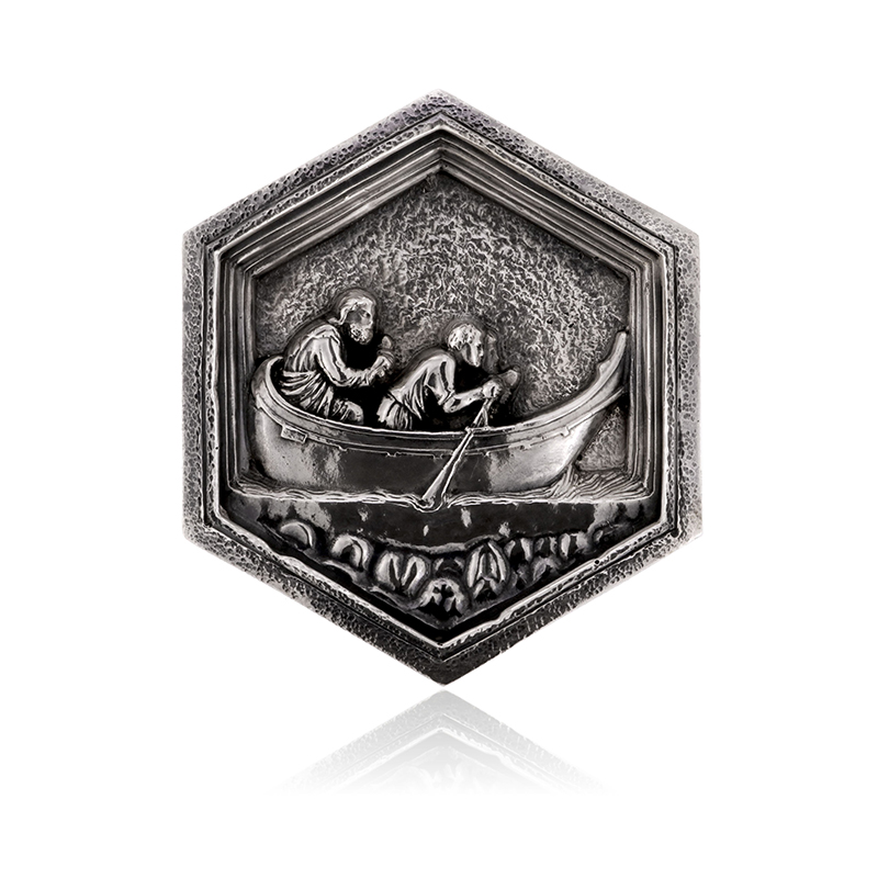 L’imbarcazione rappresenta il simbolo del desiderio dell’uomo di scoprire nuove terre. Riproduzione in argento della formella esagonale situata sul Campanile di Giotto, a Firenze, ideata da Giotto e da Andrea Pisano e raffigurante l’esaltazione del lavoro dell’uomo ed il suo processo d’incivilimento attraverso le tecniche e le arti.