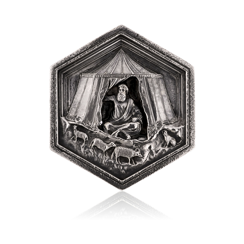 Jabal, padre di coloro che abitano sotto le tende, seduto a gambe incrociate, circondato dal gregge. Riproduzione in argento della formella esagonale situata sul Campanile di Giotto, a Firenze, ideata da Giotto e da Andrea Pisano e raffigurante l’esaltazione del lavoro dell’uomo ed il suo processo d’incivilimento attraverso le tecniche e le arti.