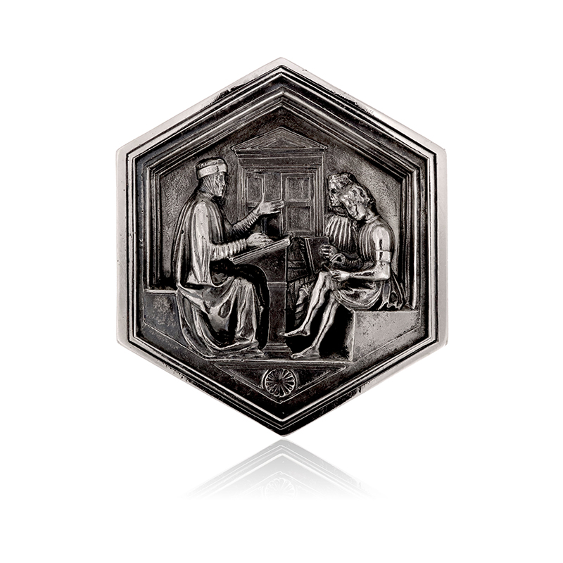 PENKO LOGO whitexweb L’erudito latino Prisciano insegna a due allievi. Riproduzione in argento della formella esagonale situata sul Campanile di Giotto, a Firenze, ideata da Giotto e da Andrea Pisano e raffigurante l'esaltazione del lavoro dell'uomo ed il suo processo d’incivilimento attraverso le tecniche e le arti.