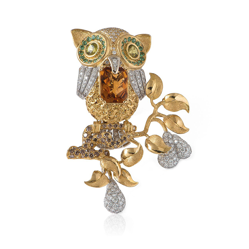 Spilla realizzata con cinque sfumature diverse di colore di oro, impreziosita da tormaline, tzavoriti, zaffiri gialli, diamanti brown, yellow, white e un quarzo citrino proveniente dal Madagascar. Il gioiello ritrae una civetta posata sul ramo di un pero.