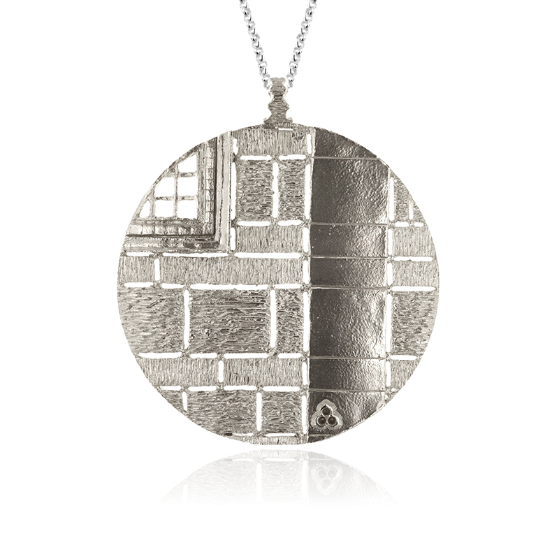 The silver pendant, made by lost wax casting and worked with the “penkato” technique, reproduces a detail of the facade of Palazzo Rucellai, in Florence, designed by the great architect Leon Battista Alberti.