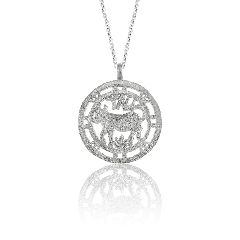PENKO LOGO whitexweb Silver pendant inspired by the signs of the zodiac inside the wheel of the Zodiac depicted on the floor of the Baptistery of Florence. The frame is worked with the penkato technique.