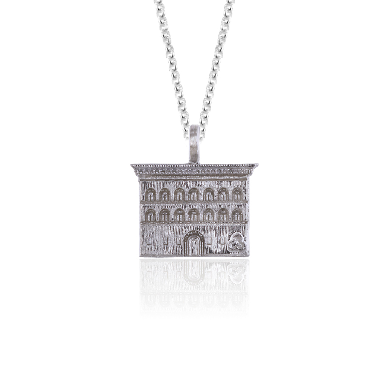 Il pendente in argento, realizzato a fusione a cera persa e lavorato con la tecnica del bugnato, riproduce un dettaglio della facciata di Palazzo Strozzi, a Firenze.