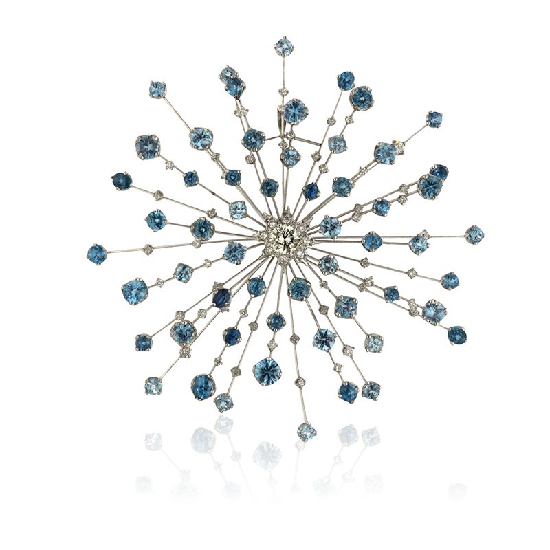 PENKO LOGO whitexweb Pendente in oro bianco, diamanti e starliti (zirconi del Siam). Secondo la leggenda queste pietre dalle varie sfumature di azzurro sono portatrici di fortuna, saggezza, allegria e senso di giustizia.