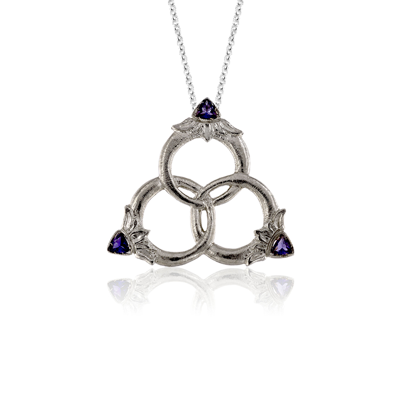 PENKO LOGO whitexweb Pendant with Medici emblem, inspired by that depicted in the work "Pallas and the Centaur" by Sandro Botticelli. Uffizi Gallery - Florence. Jewel displayed on the occasion of the exhibition-event on Botticelli at Palazzo Strozzi in Florence. The pendant is made of silver and is embellished with three iolites.