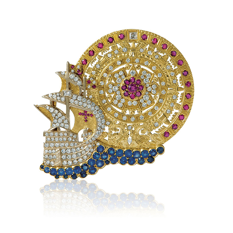 PENKO LOGO whitexweb Spilla realizzata in occasione delle Colombiadi, raffigura una delle caravelle di Colombo che naviga verso un mondo “nuovo” per gli Europei, ma “antico” per la sua civiltà, simboleggiata dalla “Pietra del Sole”.